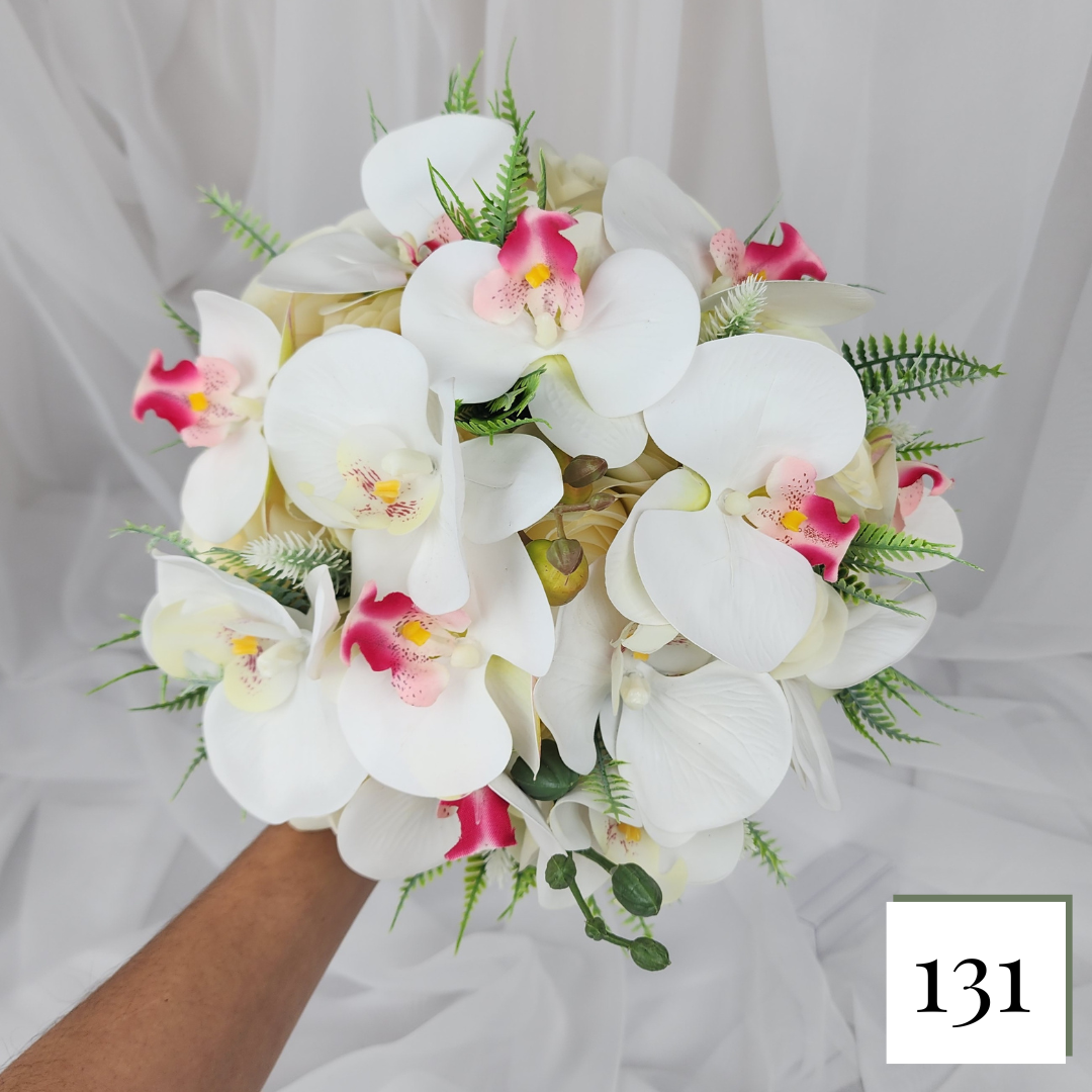 Buquê arredondado com rosas  e orquídeas, tamanho M com cabo realista no cetim off withe